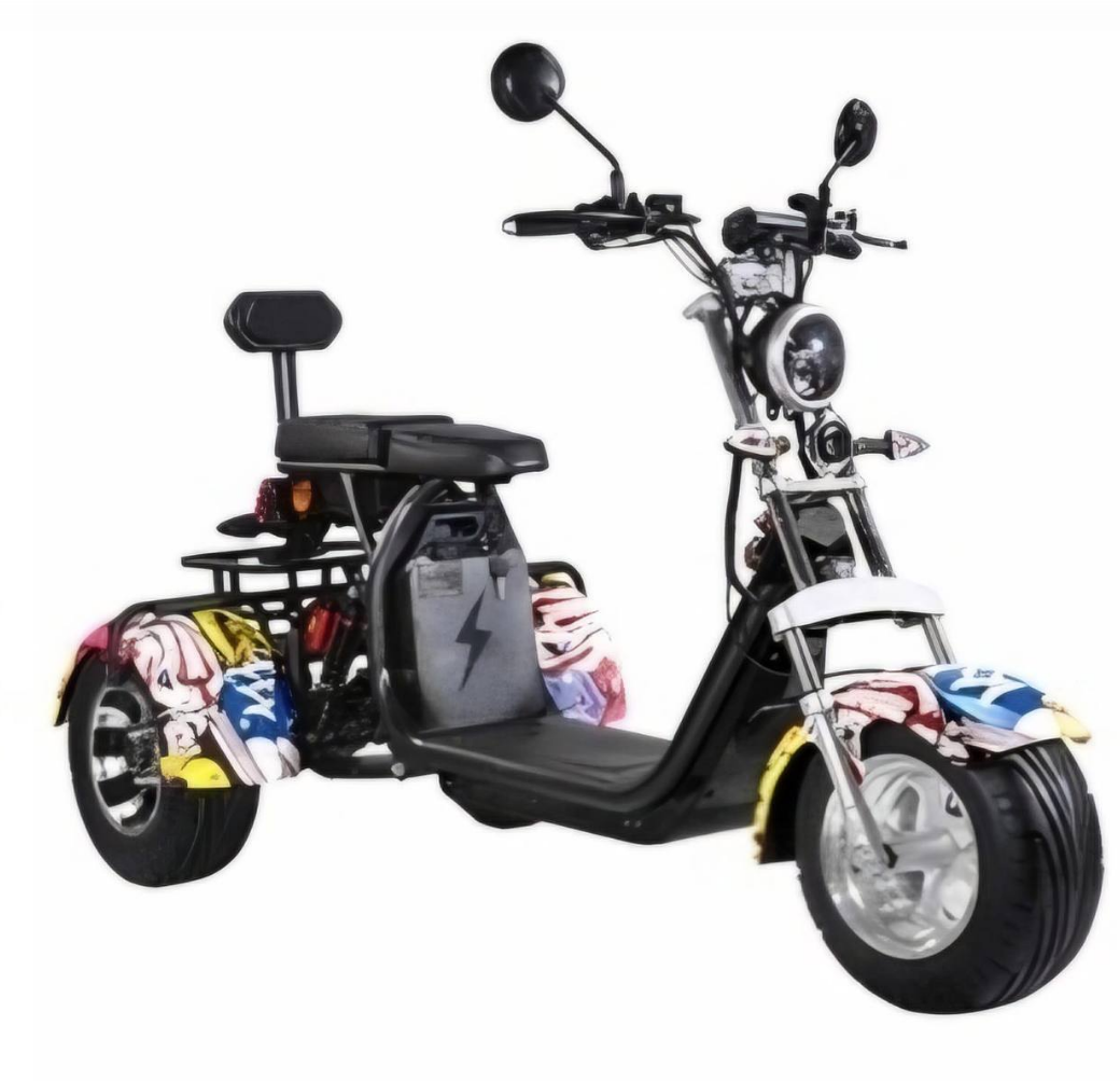 Additional Equipment: Comes equipped with a horn, rear-view mirrors and a back rack for shopping.